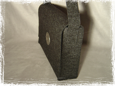 Da passt was rein. Eine große, robuste Tasche aus 3 mm starkem Wollfilz. Die Tasche ist ca. 40 x 26 cm groß und 8 cm tief. Sie hat auch eine Innentasche mit Reißverschluß. Vorne ist eine große Metall-Niete, ca. 65 mm Durchmesser, angebracht. Verschließen lässt sie sich mit einem Klettverschluß.