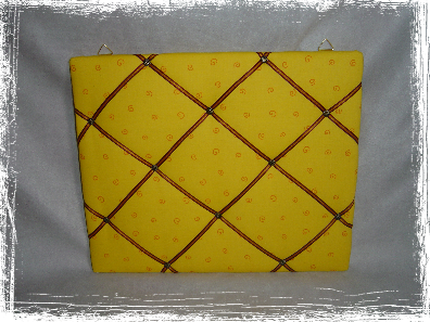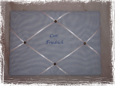 Pinwände in verschiedenen Größen, wattiert auf stabiler Holzplatte und mit Baumwollstoff bezogen. Die Rückseite ist mit Filz bezogen. Auf Wunsch können noch zwei Befestigungshaken aus Messing angebracht werden.