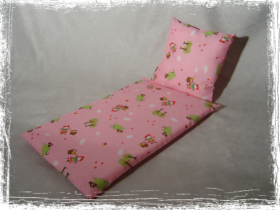 Süsse, weiche Puppenbettwäsche bestehend aus Kissen und Decke. Die Bettdecke ist mit dickem Vlies wattiert und das Kissen mit weicher Füllwatte gefüllt. Die Decke ist ca. 45 x 30 cm und das Kissen 22 x 22 cm groß. Auch andere Größen sind auf Anfrage möglich.